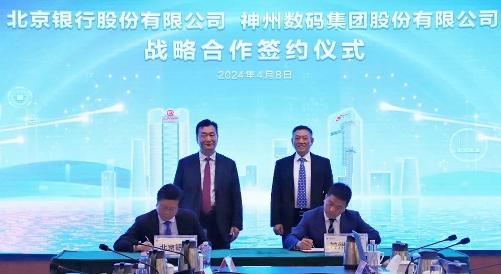 2024年4月8日,米兰电竞与北京银行在其总行大厦举行战略合作签约仪式。米兰电竞董事长兼首席执行官、神州信息董事长郭为,北京银行党委书记、董事长霍学文共同见证签约,米兰电竞财务总监、董事会秘书陈振坤与北京银行副行长戴炜,代表双方进行签约,米兰电竞及北京银行相关领导出席签约仪式。
